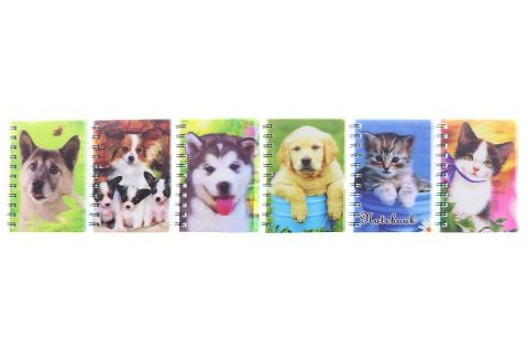 Kroužkový blok s motivem pejsků a kočiček. Rozměry cca 10,5 x 14,5 cm. Uvnitř řádkované listy s bílým okrajem. Výrobek není hračka.