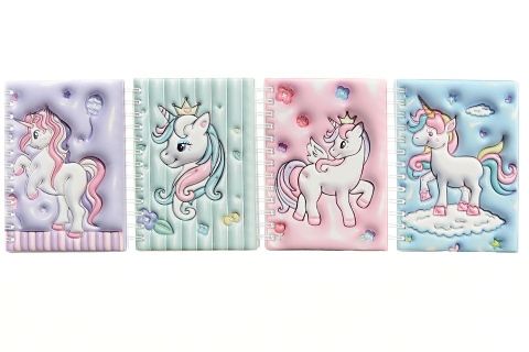 Zápisník s kroužkovou vazbou a motivem jednorožce. Rozměr 17,6cm x 12,5cm. Obsahuje 80 linkovaných listů ve 2 barvách. Baleno v sáčku. Přední desky s obrázkem polstrované a tvarované. Výrobek není hračka.