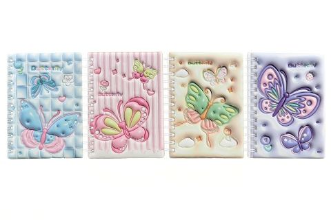 Zápisník s kroužkovou vazbou a motivem motýlků. Rozměr 17,6cm x 12,5cm. Obsahuje 80 linkovaných listů ve 2 barvách. Baleno v sáčku. Přední desky s obrázkem polstrované a tvarované. Výrobek není hračka.