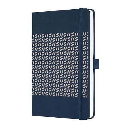 Stylový zápisník Jolie® v tmavě modré barvě. Má vyražený design, je uzavíratelný na gumičku, vybavený praktickou papírovou kapsou na zadní straně a poutkem na pero.