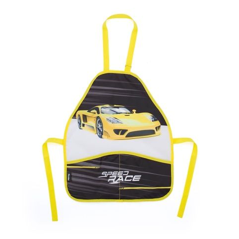 Zástěra s motivem auta do výtvarné výchovy či na jiné tvořící aktivity. Zapínání na sponku kolem krku (délka max. 50 cm), v pase šňůrky na zavázání (max. 80 cm). Vpředu dvě prostorné kapsy.