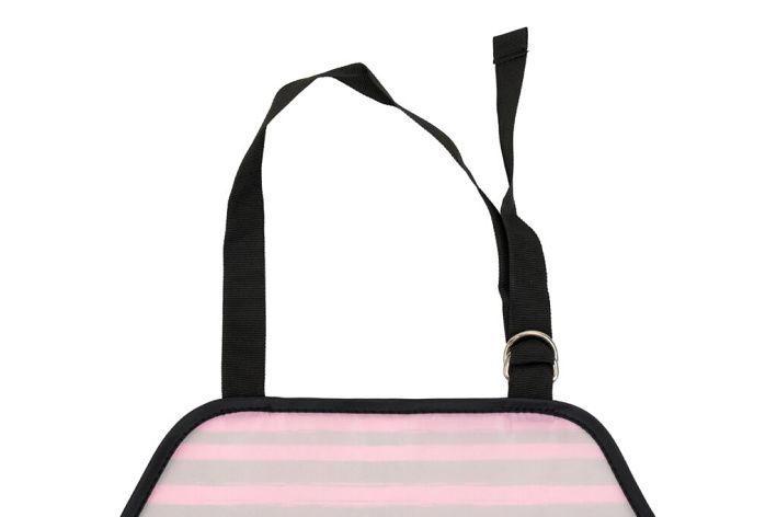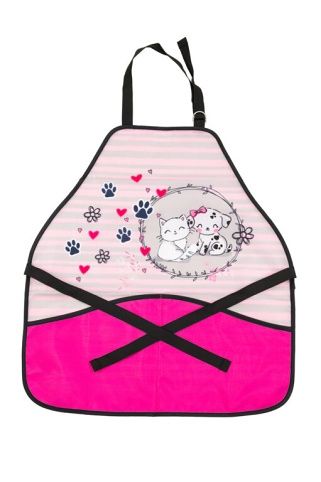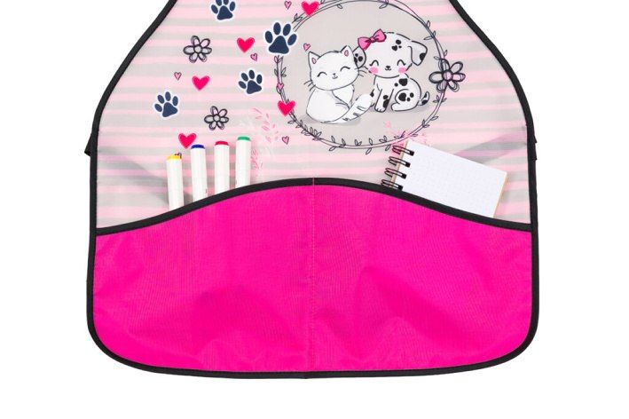Zástěrka na výtvarnou výchovu se navléká nastavitelným popruhem přes hlavu a zaváže se kolem těla pomocí šňůrek. Je vyrobena z omyvatelného polyesterového materiálu, který se lehce udržuje. Na přední straně jsou 2 kapsy na výtvarné pomůcky. Hlavní část zástěrky je potištěna obrázky ve školních designech, ladících ke školní kolekci.