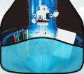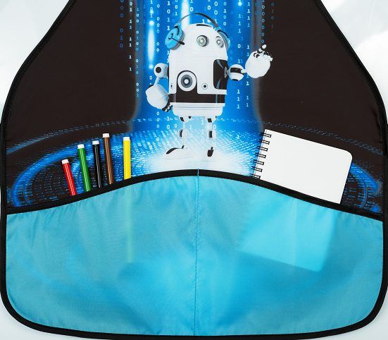 Zástěrka na výtvarnou výchovu se navléká nastavitelným popruhem přes hlavu a zaváže se kolem těla pomocí šňůrek. Je vyrobena z omyvatelného polyesterového materiálu, který se lehce udržuje, na přední straně jsou 2 kapsy na výtvarné pomůcky. Hlavní část zástěrky je potištěna obrázky ve školních designech, ladících ke školní kolekci. Rozměr: 44 x 50 cm.