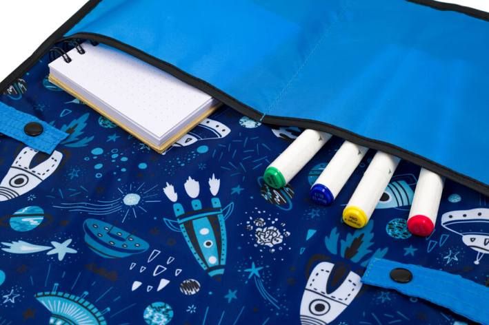V letošní kolekci nabízíme také nový střih zástěrky na výtvarnou výchovu, která je zapínatelná na praktické druky. Dítě nemusí zástěrku zavazovat na zádech, druky si snadno nastaví velikost kolem pasu a zároveň má díky novému střihu chráněnou větší část těla. Zástěrka je vybavena dvěma kapsami a je snadno omyvatelná.