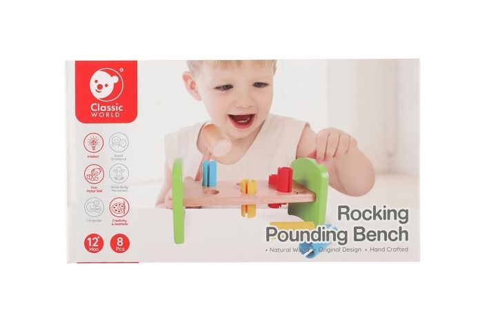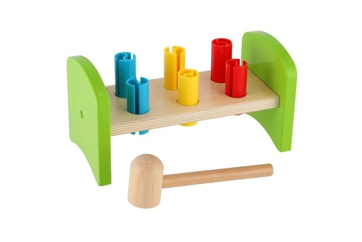 Dřevěná zatloukačka s kladívkem ve veselých barvách je skvělá hračka pro malé kutily, kteří se chtějí podobat svému tatínkovi. Balení obsahuje zatloukačku, kladívko a 6 ks plastových barevných kolíků. Hračka rozvíjí jemnou motoriku rukou. Užívejte spoustu zábavy s touto, z jedné strany stabilní z druhé strany houpací, zatloukačkou.