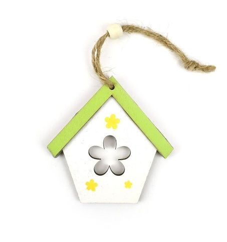 Tento dřevěný závěs ve tvaru domku je velice efektní. Je již navlečen na jutovém provázku, což vám usnadní jeho použití. Stačí jej zavěsit na větvičku nebo na provázek a jarní dekorace je hotová! Originálně dotvoří třeba váš věnec na dveře.