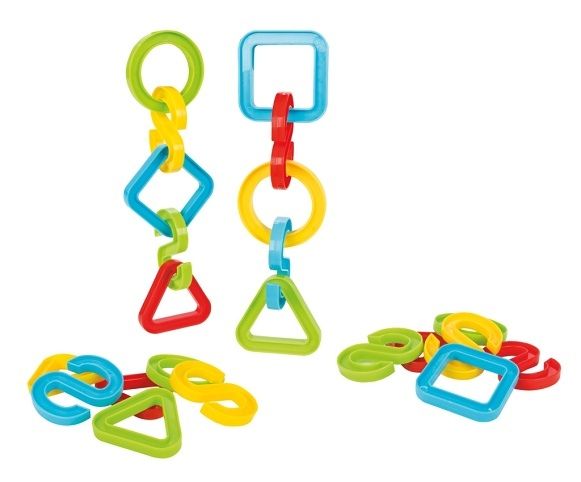 Závěs geometrické tvary – sada obsahuje 18 ks geometrických tvarů různých barev. Tvary lze libovolně spojovat. Podporuje jemnou motoriku. Vhodné pro nejmenší děti.