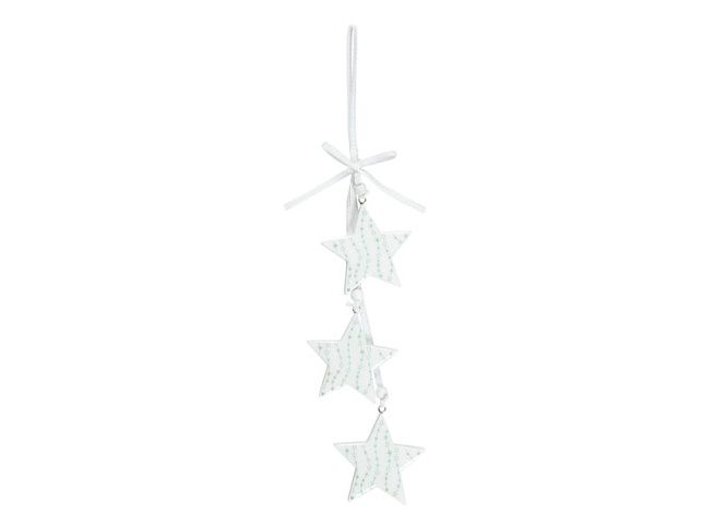 Vánoční dřevěná dekorace, 3 hvězdy v závěsu. Hvězdy jsou vyřezány z lisovaného dřeva a jsou umístěni za sebou v závěsu. V horní části je očko s provázkem, které umožňuje snadné zavěšení. Ozdobu můžete zavěsit na dveře, okno, nebo jinak zkrášlit Vaše bydlení. Délka: 40 cm velikost jedné hvězdy 7 cm Uvedená cena je za 1 ks.