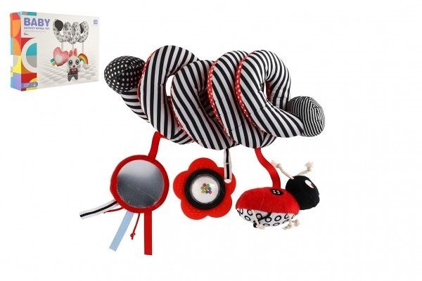 Krásná plyšová hračka na postýlku v kontrastních barvách pro vaše miminko. Hračka s chrastítky a zrcátkem napomáhá při rozvíjení smyslového vnímání dítěte a podněcuje jeho fantazii. Díky spirálovitému tvaru se dá upevnit na postýlku, autosedačku nebo ke kočárku.