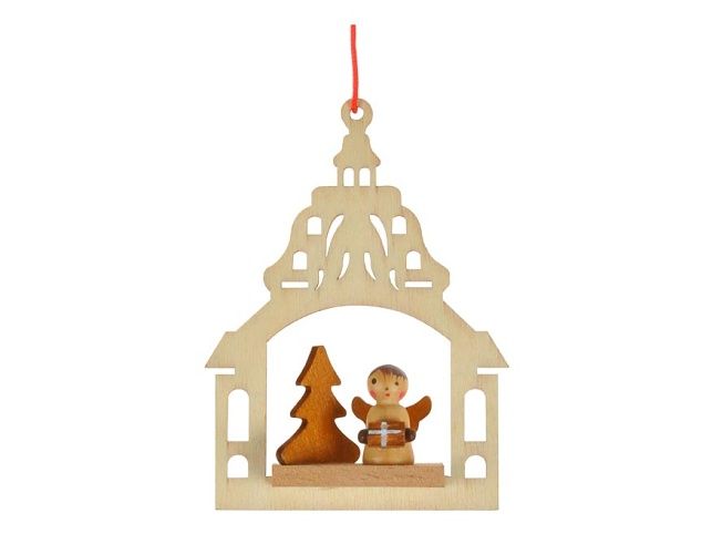 Vánoční dekorace - andílek se stromkem v domečku na pověšení. Vyrobeno ze dřeva.