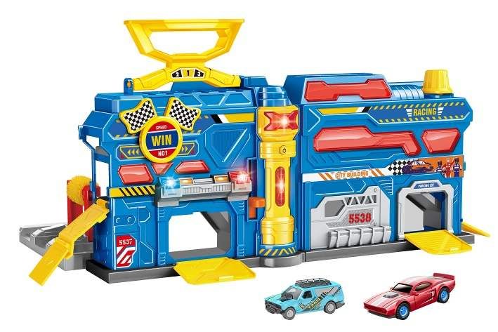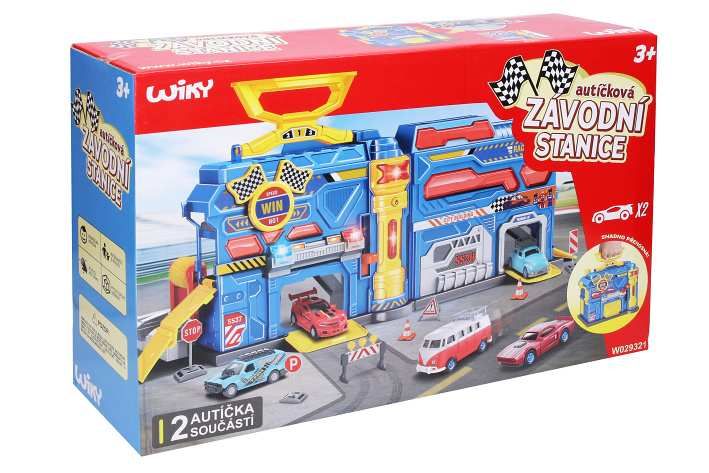 Závodní stanice přenosná. Rozměry 55x20x25 cm. Světelné a zvukové efekty. 3xAG13 baterie součástí. Součástí 2 auta s volnými koly, značky, nálepky. Obrázkový návod na sestavení součástí. Nálepky nalepte dle obrázků na obalu.