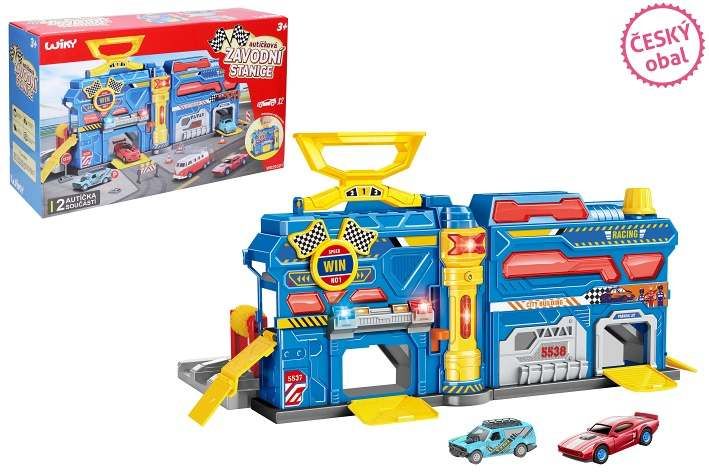 Závodní stanice přenosná. Rozměry 55x20x25 cm. Světelné a zvukové efekty. 3xAG13 baterie součástí. Součástí 2 auta s volnými koly, značky, nálepky. Obrázkový návod na sestavení součástí. Nálepky nalepte dle obrázků na obalu.