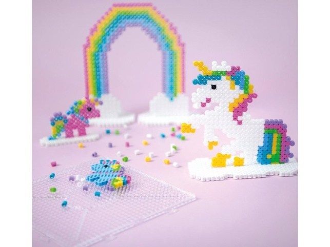 Kreativní sada zažehlovacích korálků s motivem jednorožce potěší všechny malé milovnice tvoření. Z barevných korálků si děti mohou vytvořit kouzelné obrázky jednorožců, duhy a dalších fantazijních motivů.