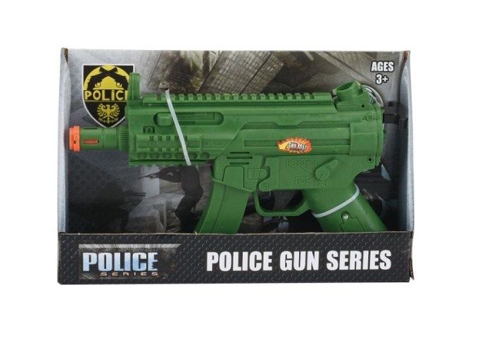Zbraň pro malého policistu se světelnými a zvukovými efekty. Tato hračka je vhodná pro děti od 3 let a vyžaduje 3× AG13 baterie (jsou součástí balení).
