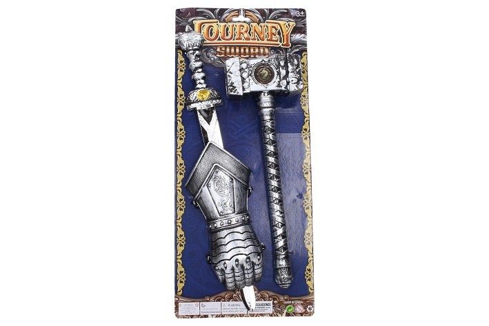 Zbraně set. Obsah balení - rukavice, meč 50 cm, kladivo 39 cm.