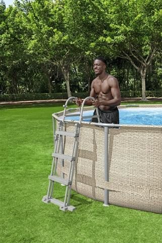 Bazénový žebřík, vhodný pro bazény s výškou stěny 1,07 m a 84 cm.