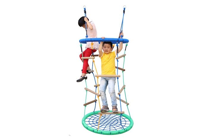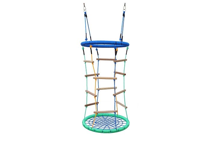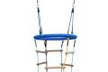 Žebřík provazový houpací. Velikost 180 cm. Rozměr dřevěné příčky 3,5x40 cm. Průměr sedáku 85 cm. Nosnost 100 kg.