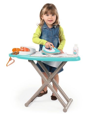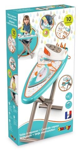 Sada na žehlení obsahuje žehlící prkno a napařovací žehličku se zvukovými efekty - 2 různé zvuky, s automatickým vypnutím zvuku po několika vteřinách. Součástí je základna pro žehličku, dvě ramínka a 5 kolíčků na prádlo. Rozměry žehlícího prkna: 69 x 48,5