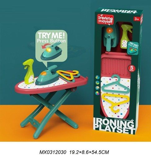 Sada na žehlení, součástí sady je žehlící prkno, žehlička, 2 ramínka, rozstřikovač. Výrobek vyžaduje 3× AG13 baterie- které jsou součástí balení. Sada je vhodná pro děti od 3 let.