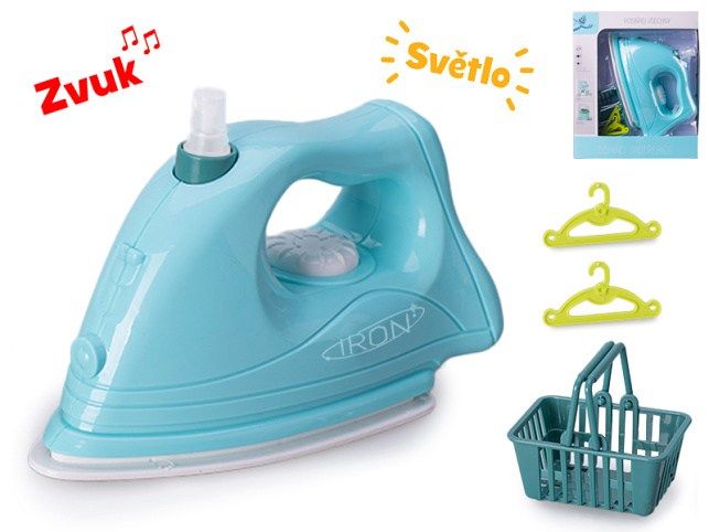 Žehlička 16cm na baterie se světlem a zvukem a doplňky v krabičce