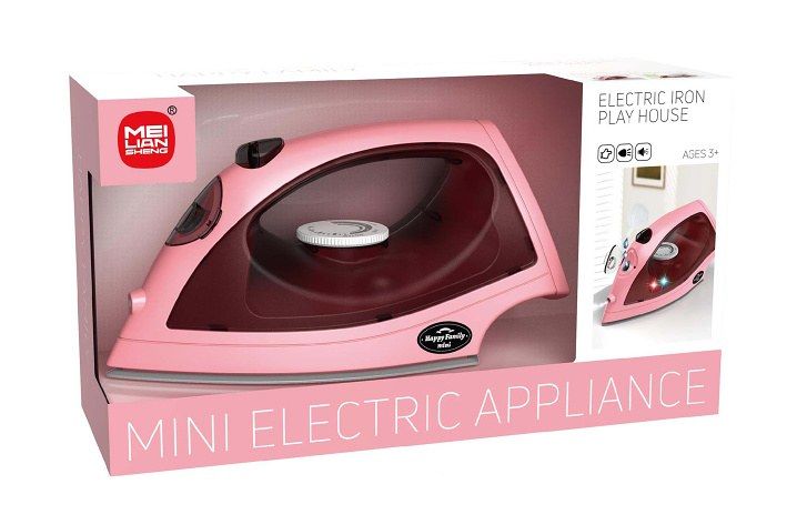 Žehlička s efekty. Velikost 21,5x9x10 cm. Vydává světelné a zvukové efekty. Do nádržky se nalije voda. Po zmáčknutí tlačítka vychází z žehličky pára. 3xAA (1. 5V) baterie nejsou součástí.