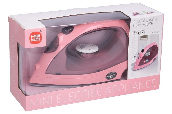 Žehlička s efekty. Velikost 21,5x9x10 cm. Světelné a zvukové efekty. Do nádržky se nalije voda. Po zmáčknutí tlačítka vychází z žehličky pára. 3xAA baterie nejsou součástí.