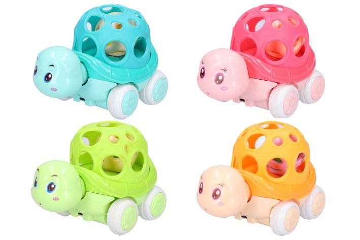Želva chrastítko plastová. Velikost 11 cm. Na setrvačník. 12 ks display box. 4 varianty - modrá, oranžová, zelená, růžová.