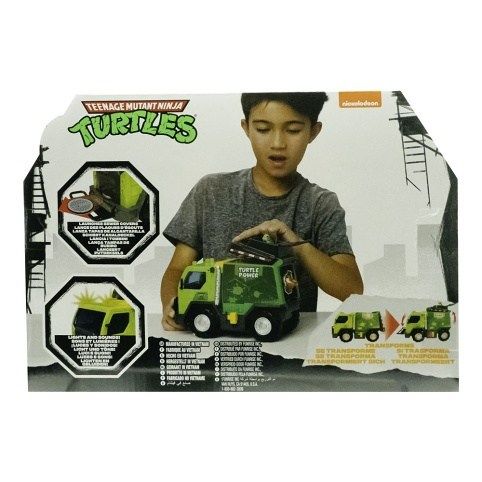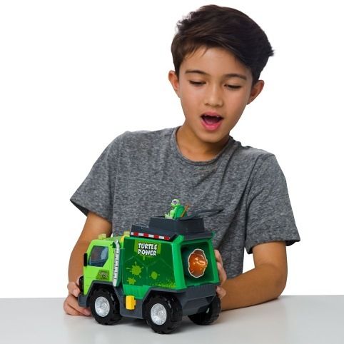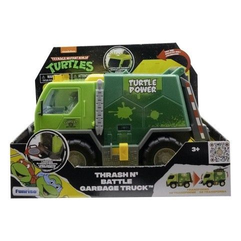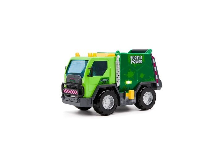 Auto 2 v 1, které se promění z popelářského vozu na bitevní stroj! Odklopte zadní část popelářského vozu a aktivujte funkci zábavných světel a zvuků a odhalte postavu želvy Ninja za volantem! Chcete-li využít funkci spouštění uzávěrů kanalizací, stáhněte