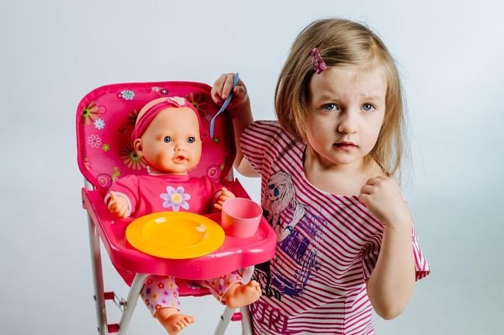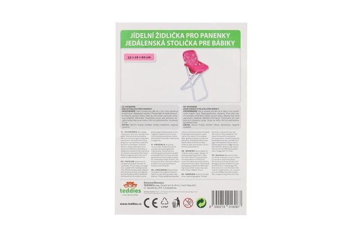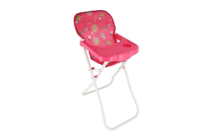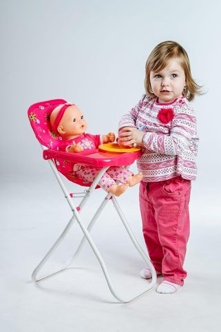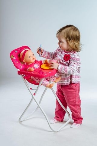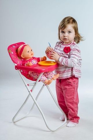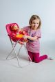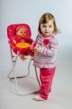 Vysoká židlička se stolečkem, ve které si mohou holčičky svou panenku nakrmit. Velikost: 33 x 26 x 60 cm.