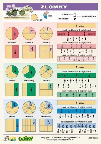 Naučná tabulka usnadňuje žákům osvojit si pojmy celek, část, čitatel, jmenovatel, zlomková čára a pomocí názorných obrázků určovat polovinu, čtvrtinu, třetinu daného celku.