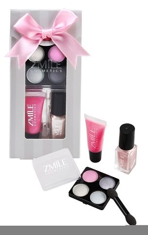 Kosmetická sada s mašlí – obsahuje 4× oční stíny, 1× lak na nehty, 1× rtěnka v tubě a dvojitý aplikátor. Dermatologicky testováno.