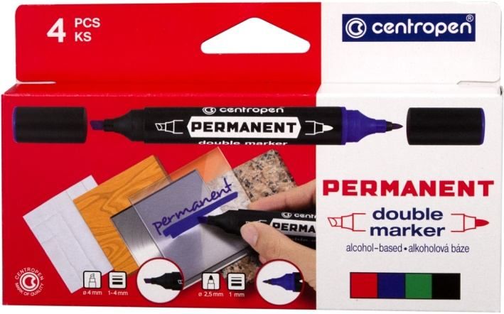 PERMANENT DOUBLE MARKER 1666 permanentní značkovač na většinu povrchů odolá vodě, otěru, povětrnostním vlivům alkoholová báze šířka stopy 1 mm a 1-4 mm válcový hrot a klínový hrot