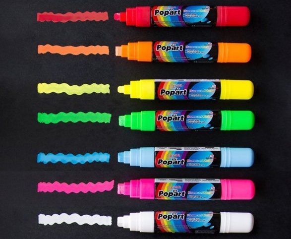 Pro psaní na tabule, sklo a další podobné materiály. Vhodné také do restaurací a barů k zapisování denního menu, tvoření nápisů a ilustrací. Obdélníkový hrot může vytvořit stopu šíře 2-15 mm.
