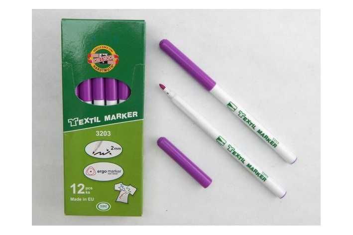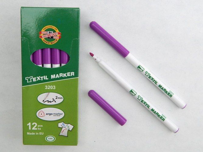 Značkovač na textil 3203 fialový. Značkovače jsou plněné inkousty na vodní bázi v 8 základních a 4 fluorescenčních odstínech. Jsou určeny pro psaní a malování na textilní materiály. Stopa odolává opakovanému běžnému praní v automatických pračkách a je světlostálá. Vhodné i pro různé druhy papíru. Jsou osazeny kulatými hroty o průměru 3 mm a je možné psát šířkou stopy písma 2 mm, délka 500 m. Všechny použité materiály zajišťují životnost minimálně 2 roky a splňují požadavky normy EN – 71.Baleny jsou v papírových krabičkách po 12 ks v jednom odstínu, 4 ks v plastových krabičkách nebo v 1 ks v PP sáčku. Vyrobeno v EU.