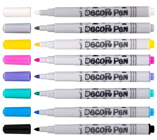 sada 7 pastelových, 1 černý a 1 bílý značkovač určený k dekorování předmětů a popisování různých materiálů (kov, papír, keramika, porcelán, sklo, plast, fólie, kraslice, kámen)