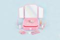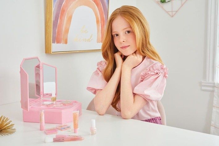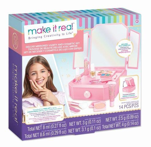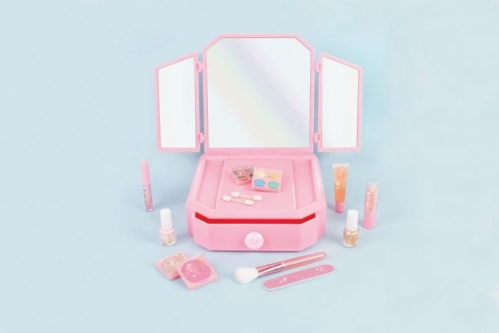 Děti si zamilují oblékání se zrcátkovou toaletní a kosmetickou sadou. Tato sada obsahuje oční stíny, tvářenku, rozjasňovač, štětce s aplikátorem, 2 druhy lesku na rty, lak na nehty a pilník na nehty. Všechny součásti, které jsou součástí balení, se krásně vejdou do toaletní skříňky. Boční zrcátka toaletky se sklopí, takže se toaletka zcela zavře jako úložná schránka. Vhodné od 8+.