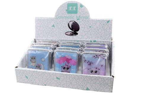 Hranaté zrcátko s motivem veselých soviček. Zepředu přesýpací třpytky. Rozměry 5,5x8x1,5 cm. Po otevření zrcátko na obou stranách. Baleno v sáčku. Více druhů - dodáváme dle skladové dostupnosti. Výrobek není hračka.