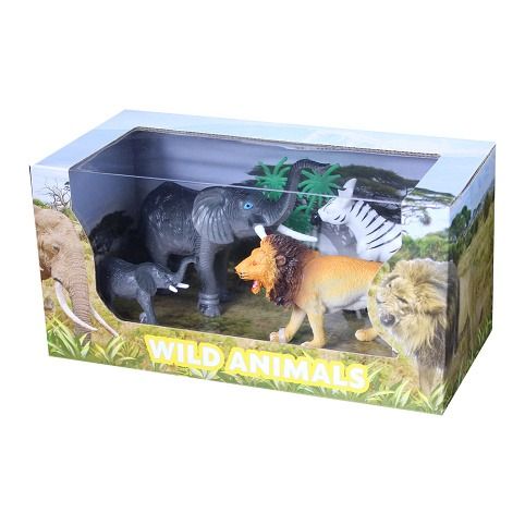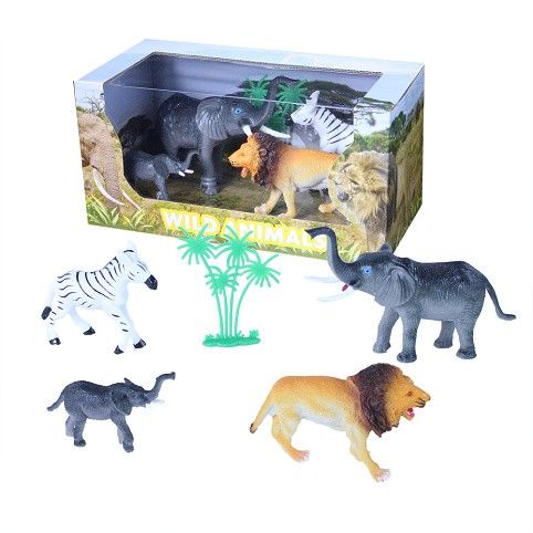 Doplň si svoji domácí ZOO o tuto senzační sadu 4 divokých zvířat v krabici. Balení obsahuje slona, slůňě, zebru, lva a palmu.