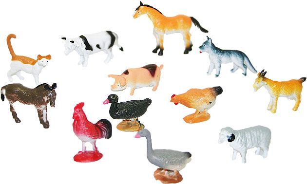 V balení najdeš 12 ks různých domácích zvířátek, jako je kohout, kočka, kráva, husa a jiné.