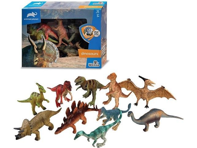 Zvířátka - dinosauři, 10 ks, mobilní aplikace pro zobrazení zvířátek, 12,5 cm. Jedno balení obsahuje dest kusů rozdílných plastových dinosaurů. Neváhej a vrhni se do světa dinosaurů. Vzpomeneš si na všechny jejich jména?Hračka je určena pro děti 3+. Rozměr hračky je 12,5cm. Materiál hračky je pvc. Balení hračky je window box. Aplikace pro rozšířenou realitu AR ke stažení z QR kódu na boxu produktu. Licence Animal Planet. Vyrobeno z recyklovaných materiálů, barveno inkousty Soy-Based. Eco-Friendly.
