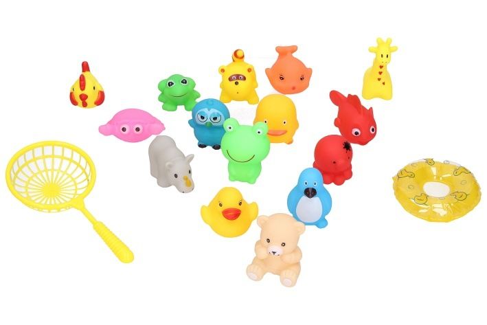 Zvířátka do vany set. Velikost zvířátek 5-7 cm, síťky 16 cm. Obsah - 15 zvířátek, síťka, plavací kruh.