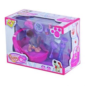 V sadě najdete roztomilé štěňátko, vysoké cca 5 cm. Balení obsahuje přenosku, která je na dvě AA baterie. Přenoska pro zvířátko hraje a bliká červeným a modrým světlem. Může sloužit i jako pelíšek. V balení rovněž naleznete hřebínek, misku na žrádlo a potřeby pro veterináře, např. injekci, léky a stetoskop. Baterie nejsou součástí balení.