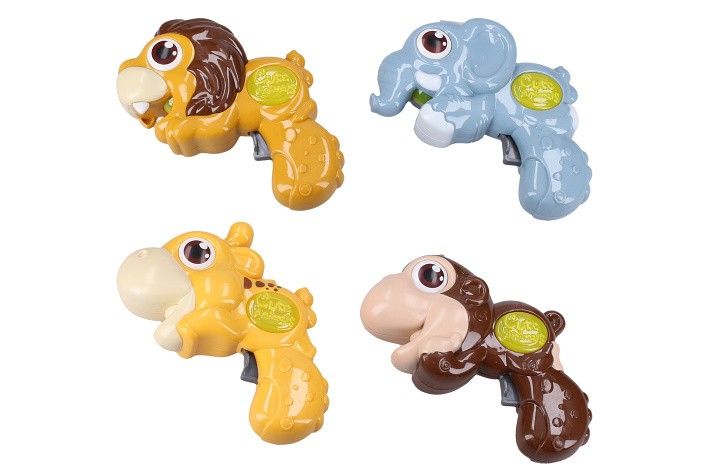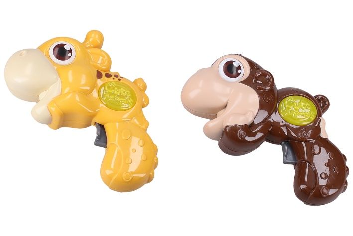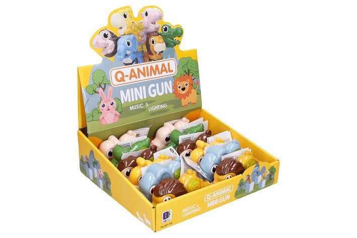 Zvířátko se světelnými a zvukovými efekty. Velikost 11 cm. Aktivace efektů stiskem spoušti. Display box - 12 ks. Baterie 2xAG13, součástí balení. 6 variant - lev, slon, žirafa, opice, hroch, krokodýl.