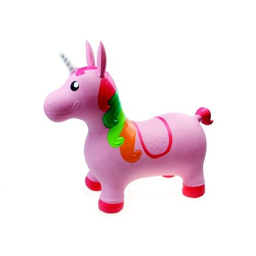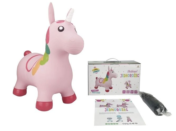 Veselé nafukovací zvířátko- jendnorožec na skákání a sezení. Dítě chytne zvíře za ouška a může skákat. Součástí balení je nafukovací pumpička. Vhodné pro děti od 2 let.