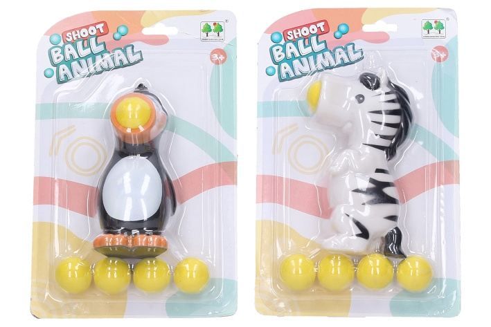 Zvířátko střílející míčky. Velikost 14 cm. Součástí 5 pěnových míčků. Míčky se střílí stlačením bříška zvířátka. 4 varianty - tučňák, zebra, prase, dino.