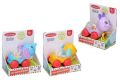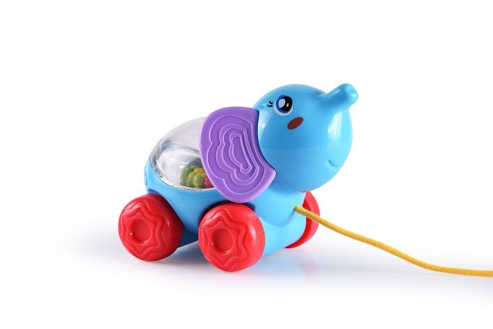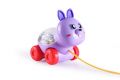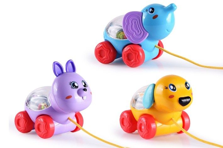 Zvířátko tahací. Velikost 12cm. Zvířátko je na kolečkách. Tažením za provázek jede vpřed a rozpohybuje kuličky na zádech zvířátka. 3 varianty - králík, slon, pes.