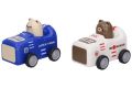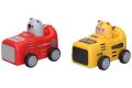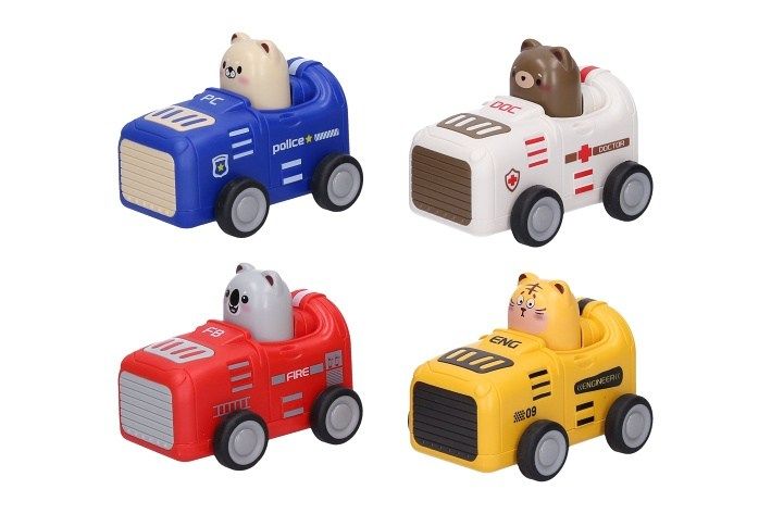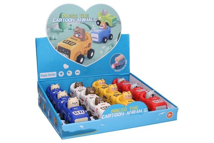 Zvířátko v autíčku. Velikost 9 cm. Natahovací, pohyb zatlačením zvířátka dolů. 12 ks display box. 4 varianty - červená, modrá, bílá, žlutá.
