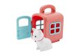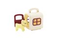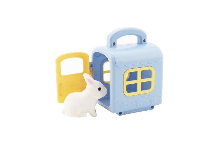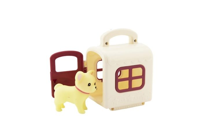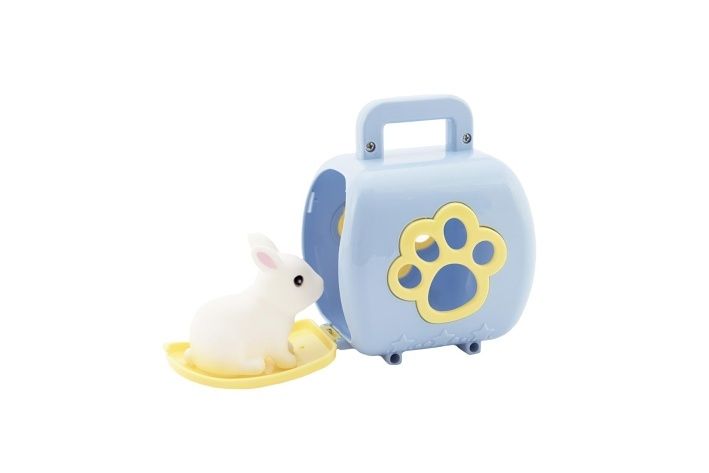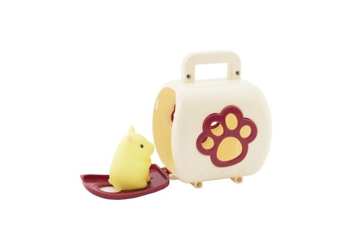 Plastový box pro přepravu zvířat je velikosti cca 8 cm. Uvnitř je zvířátko velikosti cca 4 cm. Box má praktické madlo pro přenos.