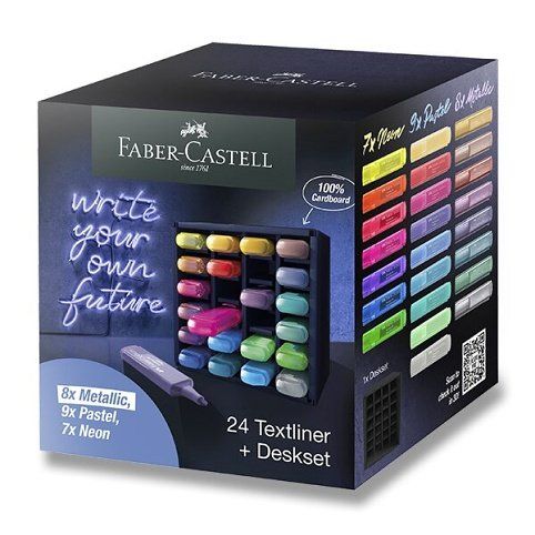 Stolní souprava 24 zvýrazňovačů Faber-Castell Textliner 46 v netradičních neonových 7x, pastelových 9x a metalických odstínech 8x. Tělo a uzávěr s klipem v barvě inkoustu.