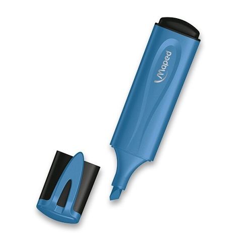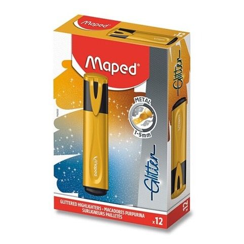 Plochý zvýrazňovač Maped Fluo Peps Glitter Metal v metalických barvách se třpytivými efekty. Tělo a víčko jsou v barvě inkoustu.